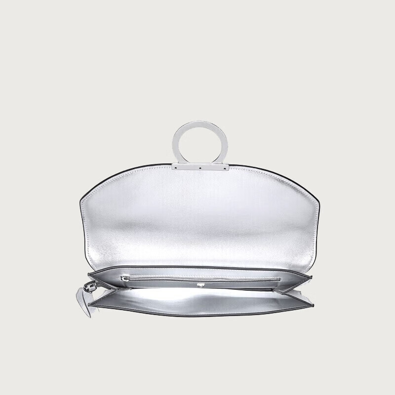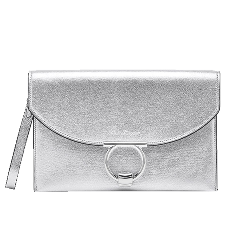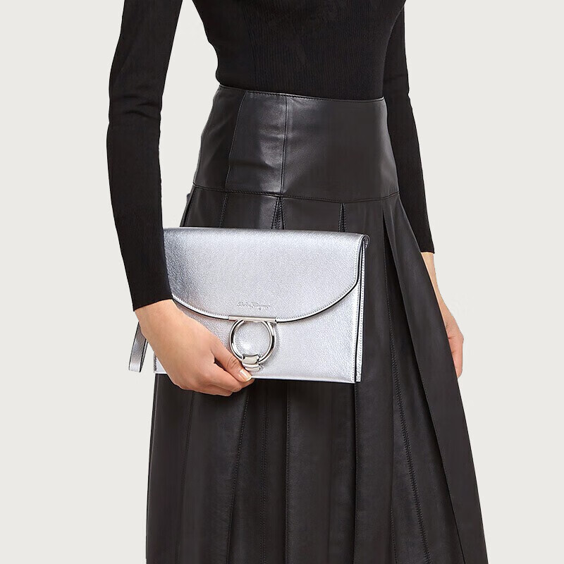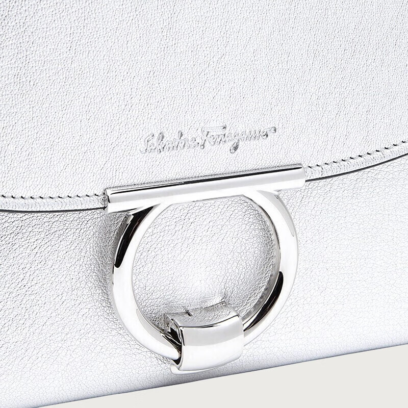 Salvatore Ferragamo 菲拉格慕 女士银色羊皮革手包 0745076 采用质感山羊皮材质,尺寸为宽4.5CM、长30CM、高19.5CM。