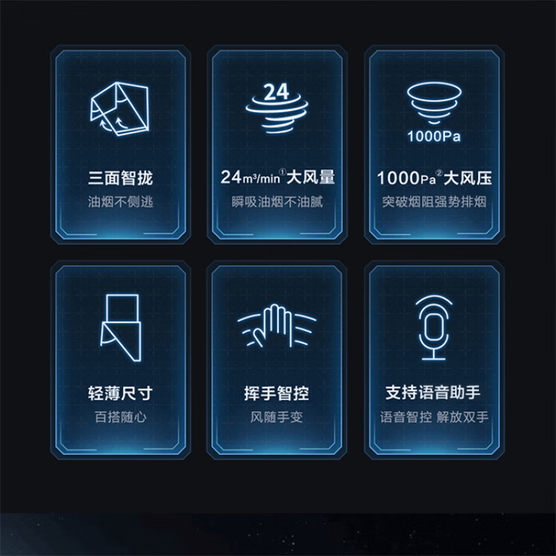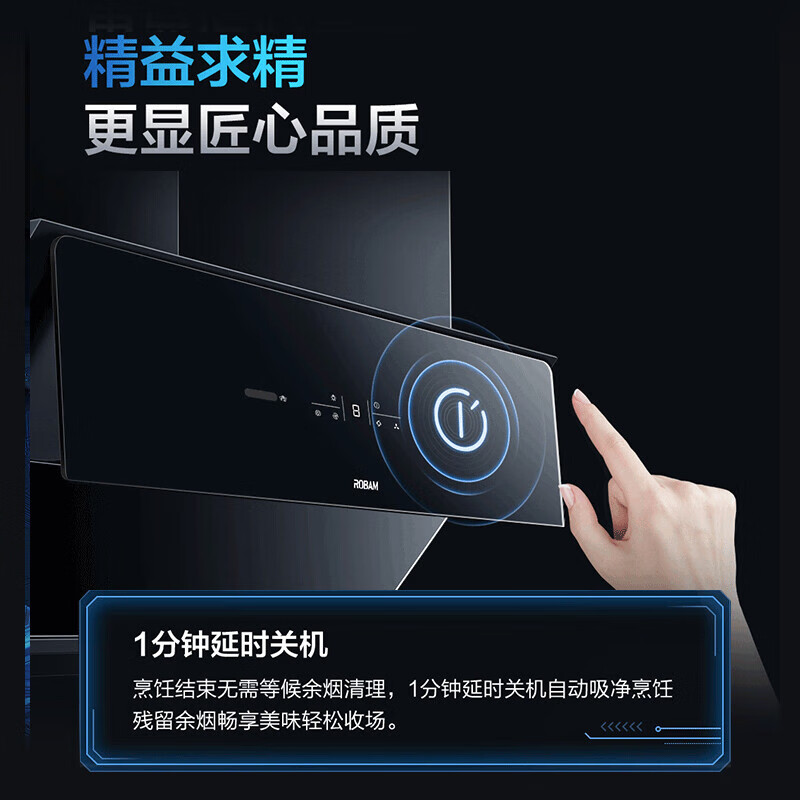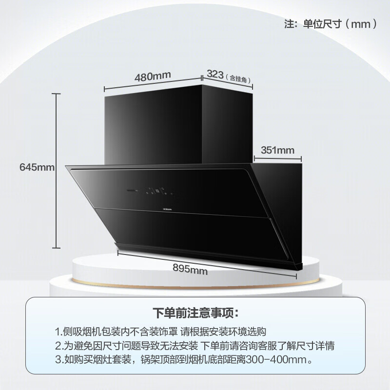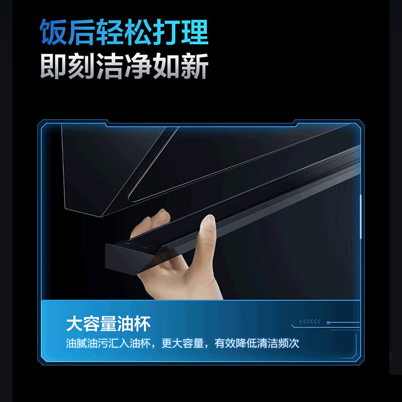 351mm侧翼深,与橱柜面板平齐;380mm烟机高, 可直接安装在橱柜下方。百搭尺寸,轻松融入 中式厨房,换新机无需改造橱柜。上下面板选用了全黑钢化玻璃材质,烹饪时油污不易粘附,一擦即净省心打理。