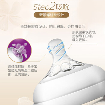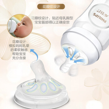 新安怡母婴用品是飞利浦国际投资有限公司在大陆投资的全资子公司,专业研发、生产母婴护理用品。旗下的产品安全好用,材质优质,在母婴市场具有超高的美誉度。这款自然系列宽口径奶瓶奶嘴内的花瓣纹可以增加灵活性,避免奶嘴使用过程中的扁塌。双阀门设计,有效减少宝宝吸入空气带来的胀气和不适。防母乳设计,给宝宝母乳般的自然感受。瓶身为高硼硅玻璃材质,不含双酚A,可用于高温消毒,耐热耐冷,人体工学设计,容易抓握,容易清洗和组装,针对不同月龄宝宝有不同容量奶瓶可供选择,比较人性化。