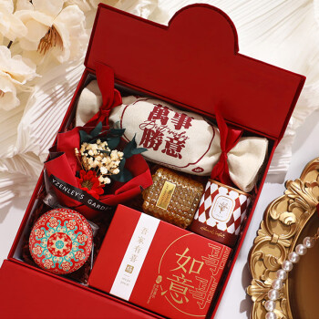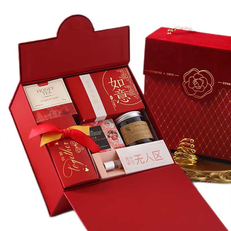 高端时尚,制造浪漫,传递幸福,通体菱化烫金,仿珠提手,给礼盒赋予新的意义。喜庆的礼物充满祝福,收获美好未来。
