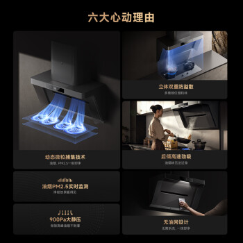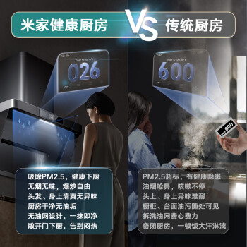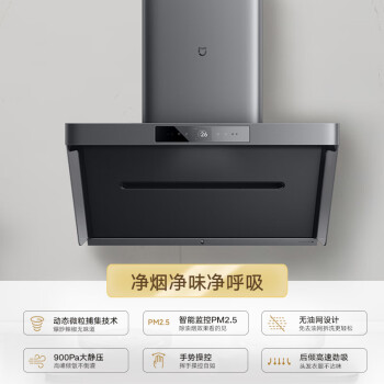 MIJIA 米家 CXW-165-MJ04CY 侧吸抽油烟机 P1,搭载BLDC变频风机,最大静压可达900Pa,最大风速可达13m/s,做饭高峰期不受公共烟道压力影响。采用动态微粒捕集技术,利用空气动力学原理,通过低压气旋从源头捕集油烟、异味、PM2.5等污染微粒,高速气流形成康达效应后倾上排,油烟不易扩散。内置空气净化器同款PM2.5传感器,烹饪时实时显示空气质量,还可以通过米家APP设定联动程序,PM2.5超标时自动为厨房换气。采用新一代手势感知技术,有效捕捉手部细微指令,识别多种手势,操作更方便流畅。支持烟灶联动,火力变化风力自动调整,并且关火延迟关机。