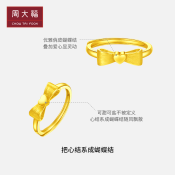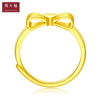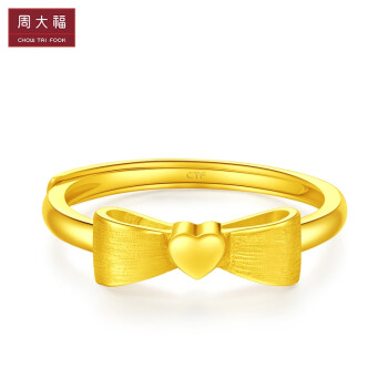 周大福(CHOW TAI FOOK)推出的这款戒指选用优质足金,经过精湛工艺制作而成,色泽靓丽,富有质感。金黄色外观搭配精美蝴蝶结,彰显清新甜美气质。活口圈型,方便调节大小。可作为礼物送给爱人、家人或朋友,表达祝福。