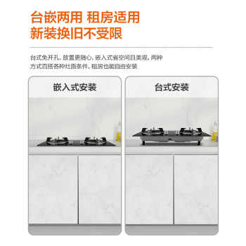 内旋火热力均匀分布,外旋火全包锅底,双层叠火释放4.2kW大火力,爆炒更有劲。大火猛小火稳,蒸煮爆炒样样精通,满足多样口味。脉冲点火,旋转按钮即可开火。全进风供氧设计,燃气燃烧更充分,造就63%高热效率,节能环保。燃氧充分混合燃烧,热效率达63%,同样烧一顿饭省更多燃气,帮你悄悄省下租房钱。台式免开孔,放置更随心,嵌入式省空间且美观,两种方式百搭各种灶面条件,租房也能自由安装。