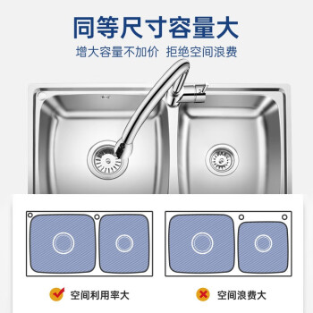 该款支持台上、台中、台下安装方式。双槽设计,大容量承载,380*350mm加大内径,升级R角,有效防止藏污纳垢,日常洗涤、清洁更轻松。选用304不锈钢,1.0mm加厚钢板,表面经过手工拉丝工艺,一体而成,光滑易洁,外层带有防凝露涂层,防止橱柜受潮。搭配冷热抽拉龙头,两种出水方式,360°可旋转,60cm抽拉范围,清洁更方便。