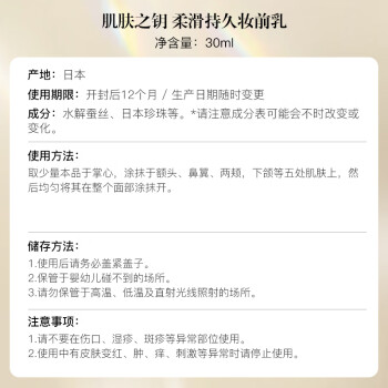 这款钻光隔离,含有光泽、柔嫩水感、融肌密着三种精华液油,配合透明质酸及百合提取物,能够有效保湿润泽肌肤,填补角质层微小结构,使肌肤平整持妆。还有反射变化、光线调控、皮脂吸附三种粉末,能够使后续妆容得到加强提亮并且更加持久。防水能力也不错,持久度很好,最适合中性偏油肌肤使用。如果使用无感的话可以尝试混合粉底液一起使用,效果非常明显,粉底液会变得更加润泽好推,且持久不易暗沉。规格:30ml。