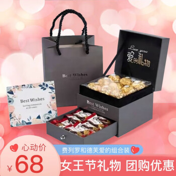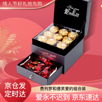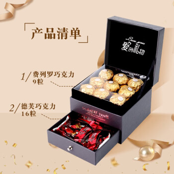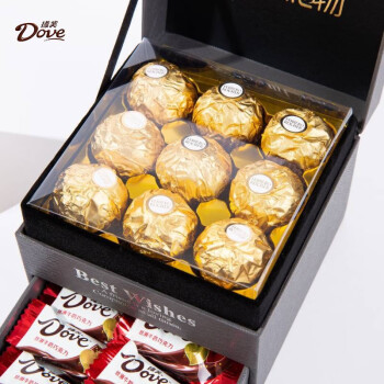 德芙 巧克力 礼盒装,内含9粒费列罗、16颗德芙巧克力。费列罗来自意大利经典工艺,开创多层式用料,松脆碎果仁和牛奶巧克力包裹威化外层,搭配香滑榛果可可酱及原粒榛果,带来多重口感享受。意大利百年传承的制作工艺,入口细致入迷,融于口中,沁人心田,每一口都妙不可言。规格:480g。