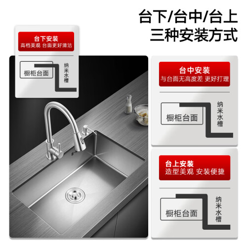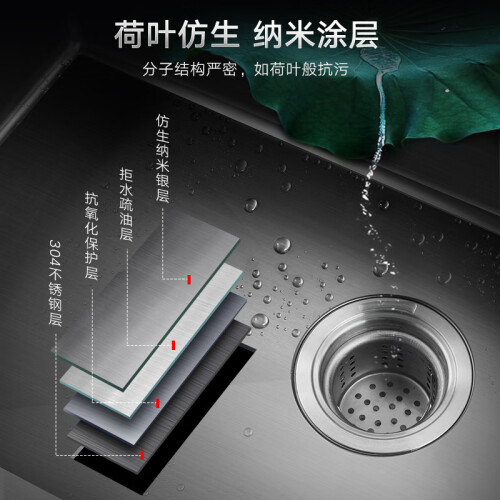 分子结构严密,如荷叶般抗污,油污附着在水槽表面。不沾水,不沾油,清洁更容易。台上安装美观大方,台下安装方便清洁。