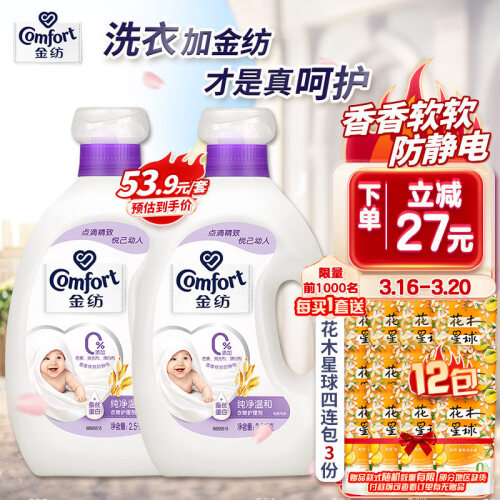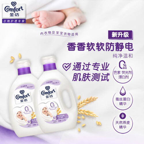 Comfort金纺是联合利华旗下的一个家庭护理品牌。这款金纺衣物护理剂含天然丝蛋白配方,能够理顺织物内部纤维,恢复衣物弹性,使衣服柔软舒适。配方纯净温和,天然亲肤不刺激,亦可用于宝宝衣物的护理,气味清新。规格:2.5L。
