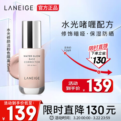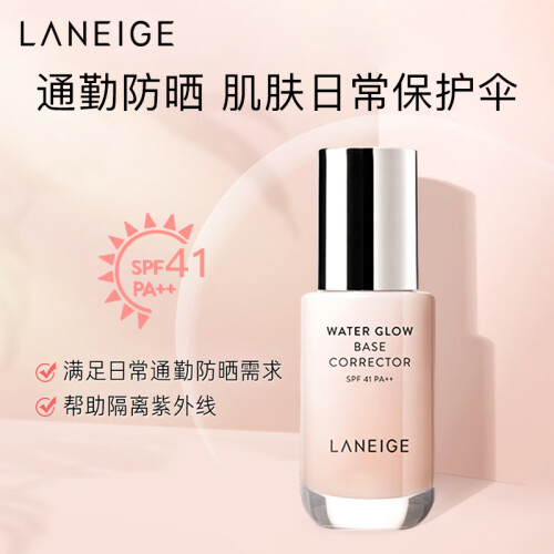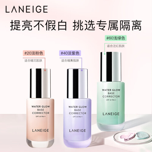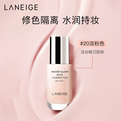 LANEIGE 兰芝 是来自韩国的化妆品品牌,旗下产品获奖无数。这款兰芝的水光修颜隔离乳的乳液质地不是很稠厚。使用后能使肤色白皙细嫩,晶莹剔透。适合肤色有缺陷,例如偏暗或有雀斑、面部有红血丝等女士使用, 是一款秀正能力较强的隔离霜。 在基础护理之后,进行上妆时第一步使用,然后再用粉底等彩妆品,帮助之后的粉底妆效果更佳。取少量于手上,用无名指从脸部内侧到外侧按皮肤纹理,如涂抹乳液般,形成使肌肤紧致细腻的水分膜,能令毛孔、皱纹隐形、打造细腻肌肤 矿物质水修复每寸肌肤~针对亚洲人常见的肤色问题,3种色号(#20玫瑰粉、#40亮紫色、#60亮绿色),满足不同肤色的需求。调制两种色调:浅紫色与浅绿色,其中粉色适合修饰肤色苍白暗淡无光的肌肤,打造健康红润有光泽的亮白肌肤。绿色用于调整偏红肌肤,有效打造无瑕肌肤,令肌肤色泽自然又均匀,呈现健康光采。紫色减少暗沉发黄,提亮肤色;规格:35ml