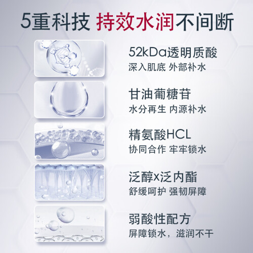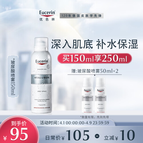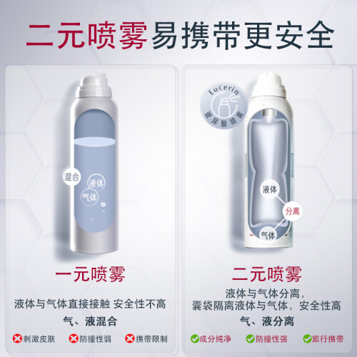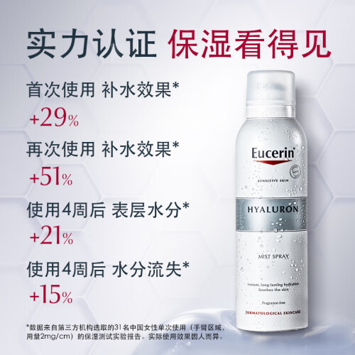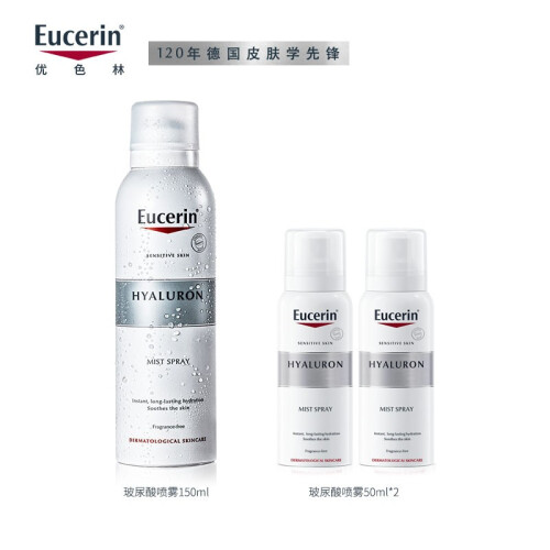 Eucerin优色林是德国百年的药妆品牌,目前归属于拜耳斯道夫集团旗下。这款充盈展颜玻尿酸保湿喷雾,主打内外双向的深度保湿润泽,添加52k道尔顿分子量的透明质酸,有效深入肌底充盈水分,并促进肌肤合成透明质酸;通过甘油葡糖苷激活肌肤各层水通道蛋白活性,增加水分和甘油等保湿因子的交换速度,将水分从肌底向表层肌肤传递,层层水润浸透;精氨酸HCL可以加强肌肤的水分保持力,减少水分流失;泛醇B5、泛内酯帮助加强保湿力,舒缓敏感损伤肌肤,加速肌肤的自愈,强化肌肤屏障。喷雾的整体pH值为弱酸性,接近肌肤自然酸碱度,更好维护肌肤微环境。这款喷雾还采用了独特的二元封装,保湿液独立包装,与助推气体分离,更好保护原料的卫生安全。