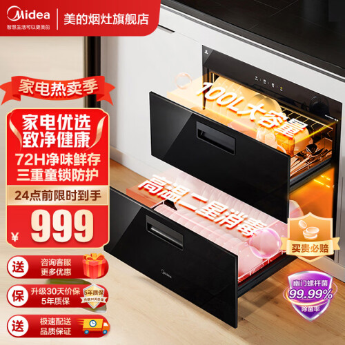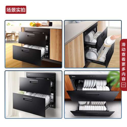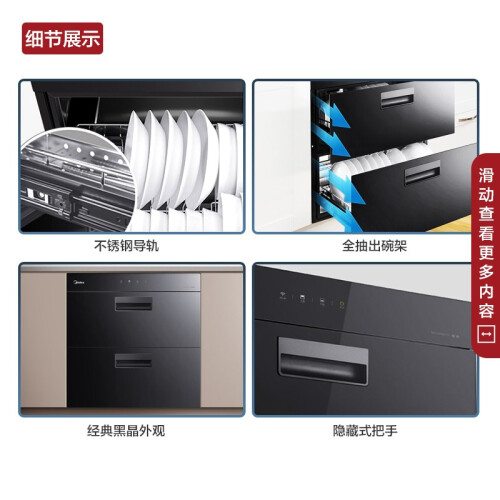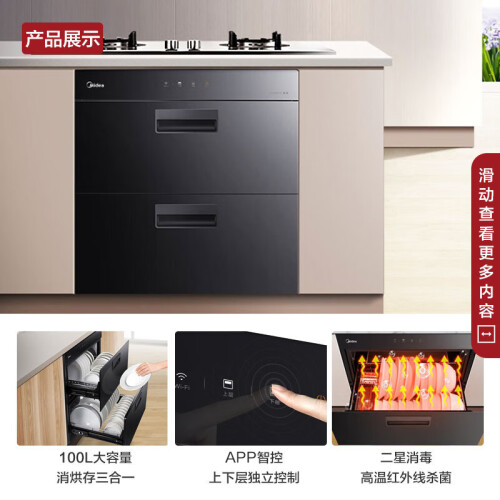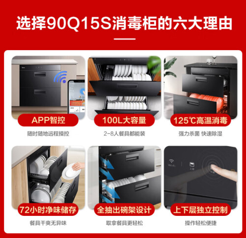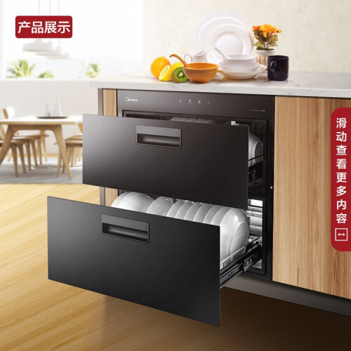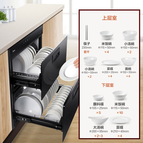 升级100L,一家老小餐具都能装,内置滑轨,惟拉流畅自如,全抽出碗架,碗碟摆放方便,二星消毒,轻松消灭顽固性细菌,85℃高温,可保洁宝宝餐具长效保洁,餐具即拿即用,上下室独立控制,随心易用操作简单,安全防护,开门停止加热,藏式拉手,防止碰撞。