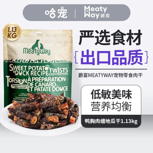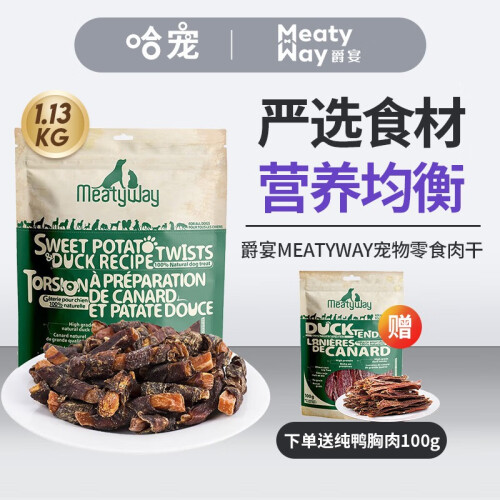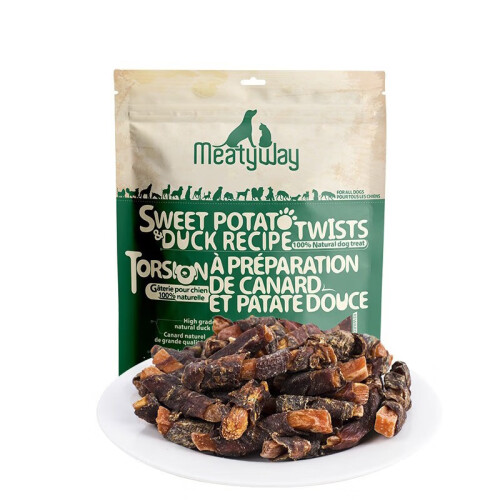 本款狗狗零食,将鸭肉缠绕在甘薯上,鸭肉含有丰富的蛋白质、脂肪、维生素b族;甘薯含有丰富的矿物质和营养维生素,肉素搭配,营养美味,双倍烘烤,口感升级,狗狗爱吃。