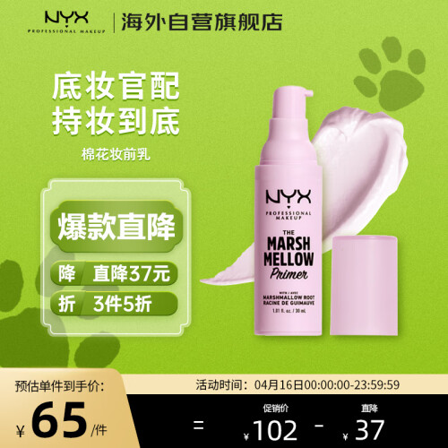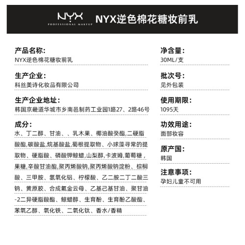 NYX 是来自美国的开价专业彩妆牌子,强调简单的生活与简单的彩妆。此款棉花糖妆前乳采用粉糖爆珠质地,水润轻盈,如棉花糖般丝滑易推开,蕴含小球藻、药蜀葵根提取物,隐形毛孔,令后续底妆持久服帖。