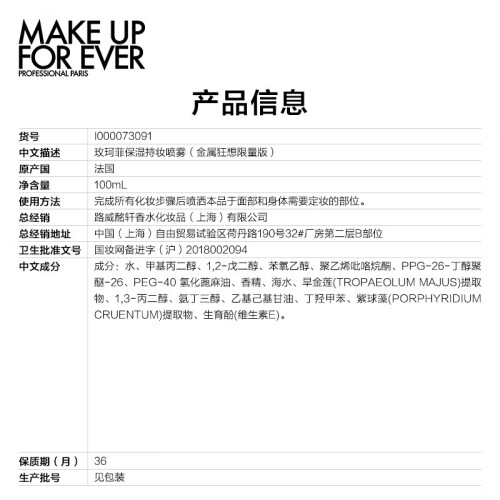 这款定妆喷雾集保湿、定妆、补水于一体,里面含有活氧复合物,提高含氧量,妆前使用,给肌肤添加光泽,丙烯聚合物可以有效形成皮肤保护膜,对抗出汗以及外部污染,妆后使用,可以防止脱妆,保湿成分的添加,可以帮助肌肤水分量,让面部妆容远离粉痕,优秀的控油能力,让出油量大大改善。