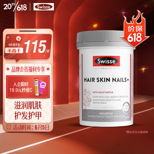 当前的位置: 首页 > 今日值得买 > Swisse斯维诗 护发护肤护甲片 100片/瓶 促进胶原蛋白生成 维持指甲头发皮肤健康 澳洲进口 热巴同款