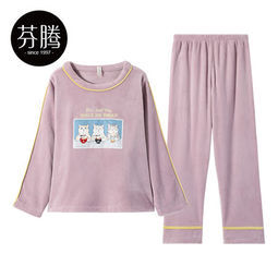 芬腾 冬季加厚加绒卡通可爱法兰绒保暖家居服套装,采用健康绒面料,色彩莹润,触感细腻柔软,舒适保暖;圆领设计,舒适穿戴不过时,胸前猫咪图案加上字母刺绣,时尚且美观;简洁撞色脚口设计,美观又舒适。线下专柜热卖,法兰绒加厚情侣家居服套装,亲肤舒适,萌趣卡通,时尚有型。