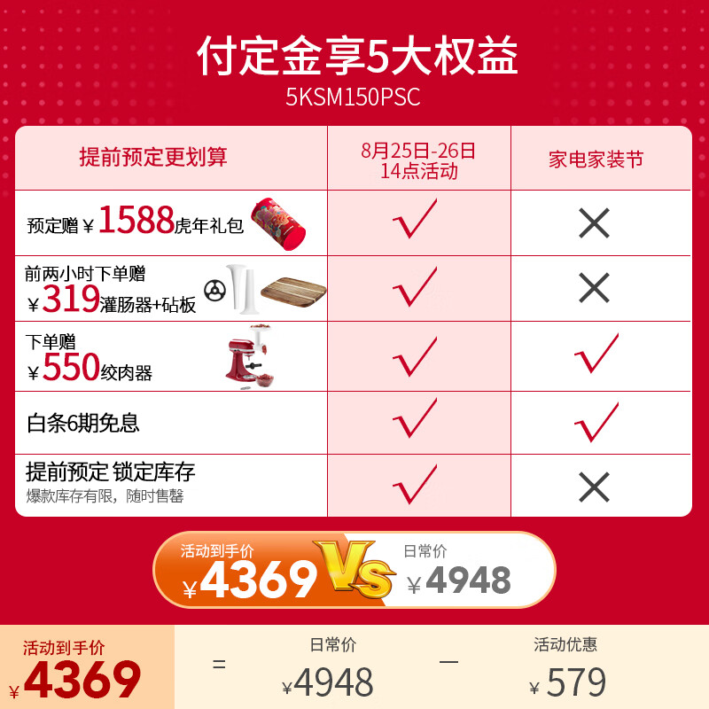 KitchenAid/凯膳怡 5QT厨师机家用4.8升厨师机和面多功能搅拌机5KSM150PSCER帝王红美国原装进口京东 推荐人: 丁丁小编 发布时间:2022-09-25 19:27:04