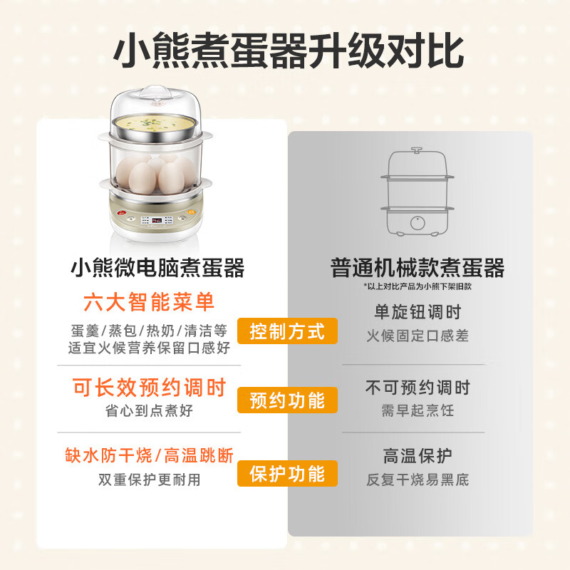 小熊(Bear) 煮蛋器蒸蛋器单层家用自动断电迷你鸡蛋羹蒸鸡蛋器蒸蛋机炖蛋器蒸蛋锅防干烧便携式电蒸锅京东 推荐人: 丁丁小编 发布时间:2023-03-29 17:02:40