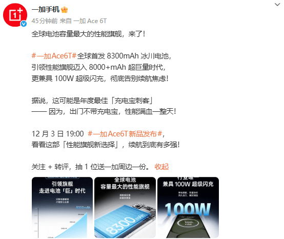 一加 Ace 6T 即将发布:8300mAh 超大....推荐人:丁丁小编 发布时间:2025-11-28 10:33:01