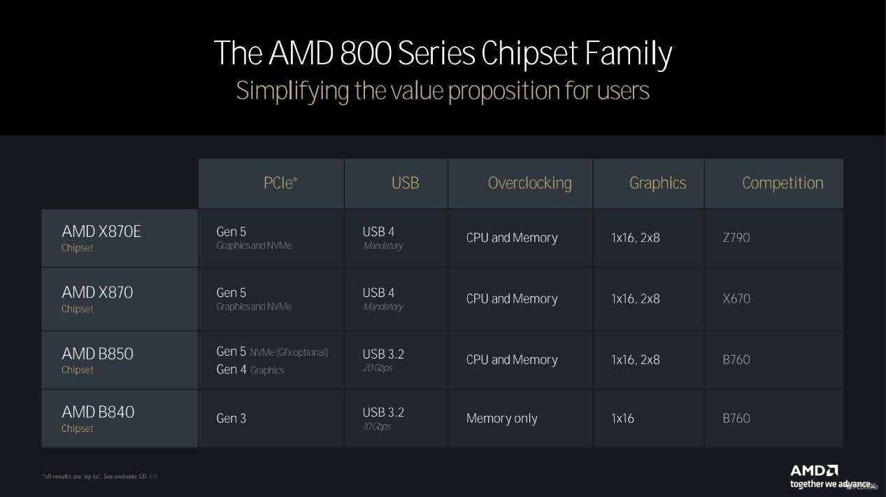 另外整个AMD 800系芯片组一共会有四款,分别是最顶级的X870E,X870以及定位主流的B850及全新的B840。不过最后这个B840更像上代的A620,其不支持超频,仅支持超频,并且南桥芯片不提供PCIe 4.0,仅有8条PCIe 3.0,而且CPU提供的PCIe通道也只有4.0,没有USB 4接口。