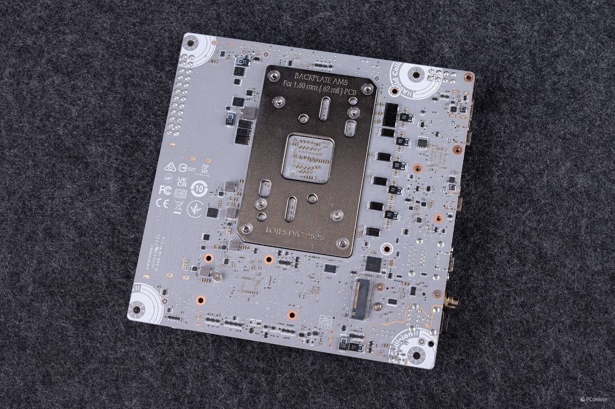 再看看背面,微星MPG X870I EDGE TI EVO WIFI刀锋 钛主板采用极度奢华的12层 PCB以及1Oz加厚铜设计,给出了强大的电气性能保障。背面整体灰色PCB 涂装,主机板电路区域清楚标示机壳螺丝锁点须避开的位置并附加保护漆,防止零组件刮伤或损坏主机板。