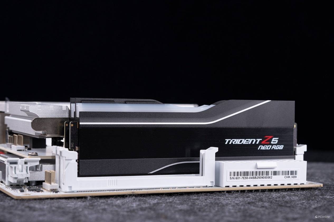 CPU插槽的旁边是内存插槽,双槽单边扣设计,最大能够支持128GB内存容量,且最高支持高达10000+MT/s的内存规格。同时它也可以支持最新一代的CUDIMM内存。