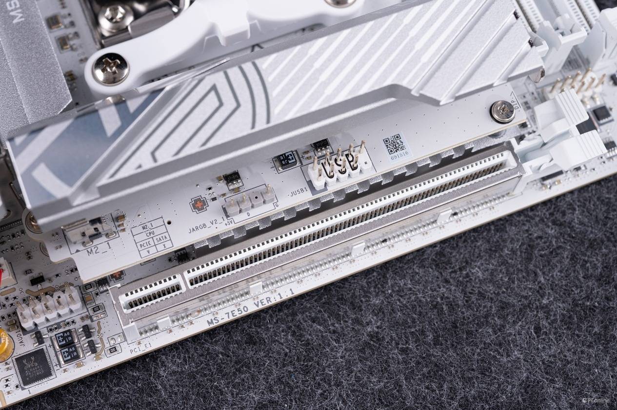 其他接口方面,这块主板的顶部设置了两个CPU风扇接针、一个水泵接针,还有一个JAF_2接口,支持EZ Conn功能,主要目的是缓解散热器需要使用过多接口的问题,搭配微星赠送的EZ 连接线,这个接口就可以分出一个4针的PWM风扇口、5V ARGB口和一个USB 2.0,从而装机时可以进一步优化机箱内部走线灵活性。