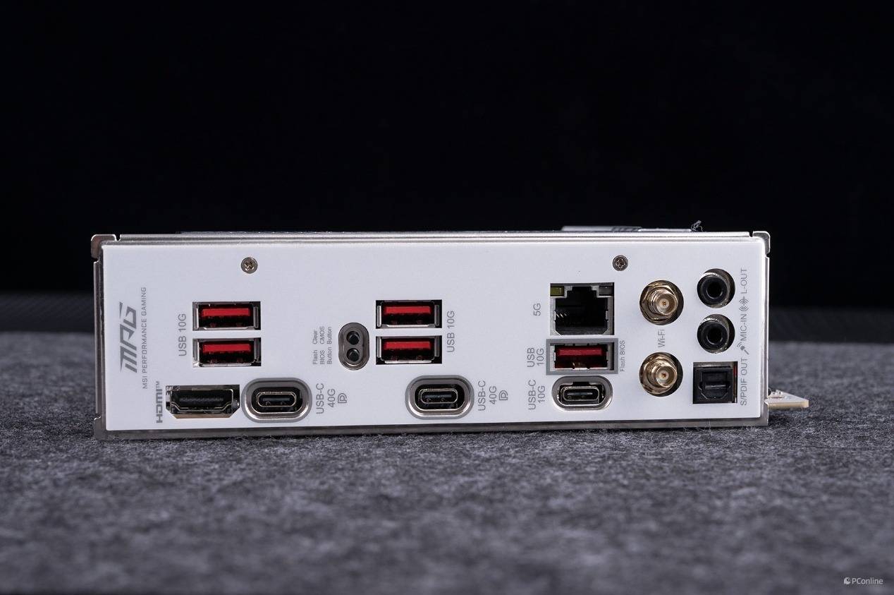 主板I/O方面,从左到右依次是一个HDMI 2.1视频输出接口,可以支持4K@120Hz视频输出;五个USB 3.2 Gen2 10Gbps A口;两个USB 4 40Gbps的C口;一个USB 3.2 Gen2 10Gbps C口以及有线网口、无线网口、2个3.5mm音频口和数字光纤输出口。
