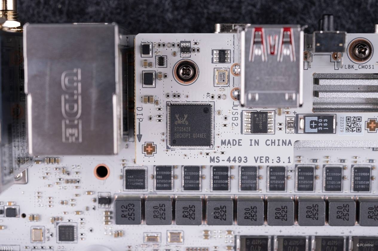 上层PCB主要用于扩展是USB 3.2 Gen 2接口,也就是我们刚刚说的USB-A 10Gbps接口,皆是由这款小小的瑞昱RTS5420芯片扩展。