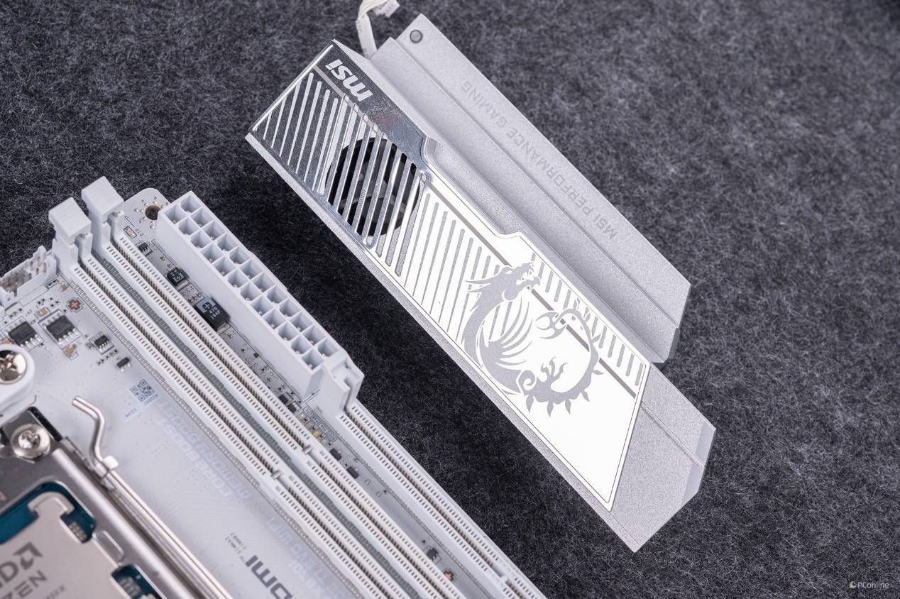 在正面的M.2固态硬盘下方还能看到一个厚实的散热装甲,分量非常足。将其背部的四颗螺丝拧出即可看到隐藏在内部的X870芯片组。