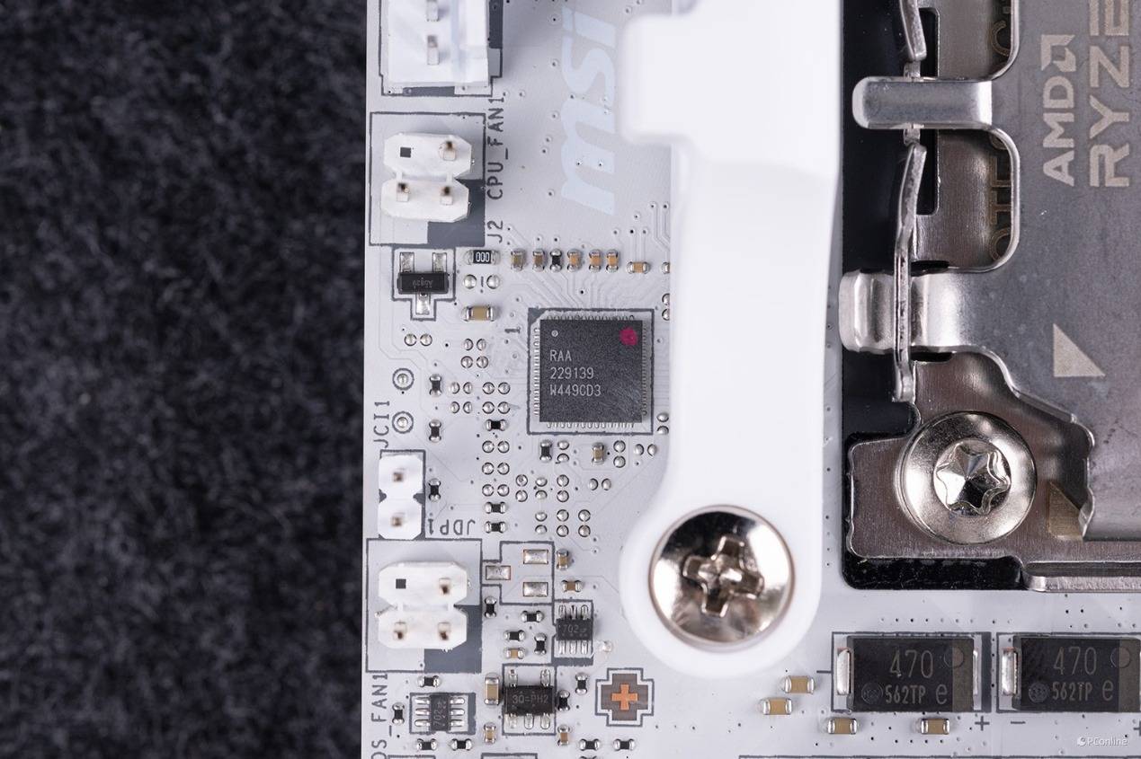 在CPU插槽的顶部则是CPU PWM控制芯片,是来自RAA的229139芯片,为3路输出的8相控制器。