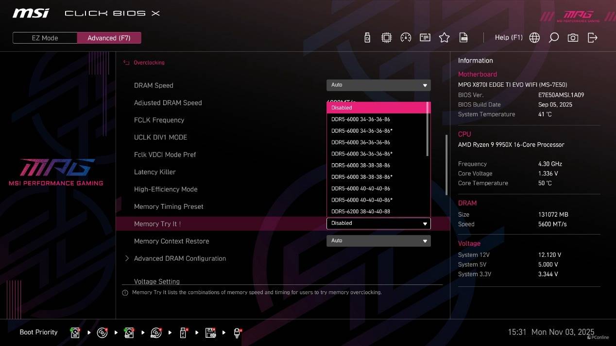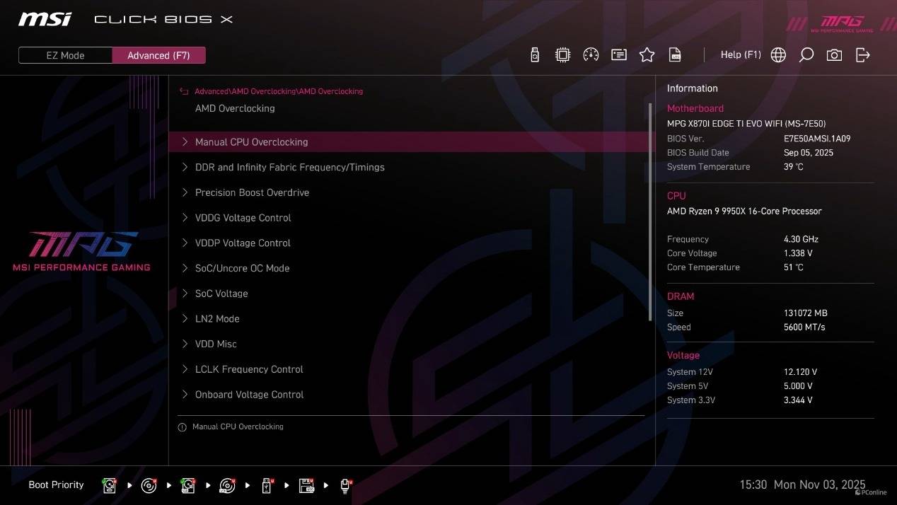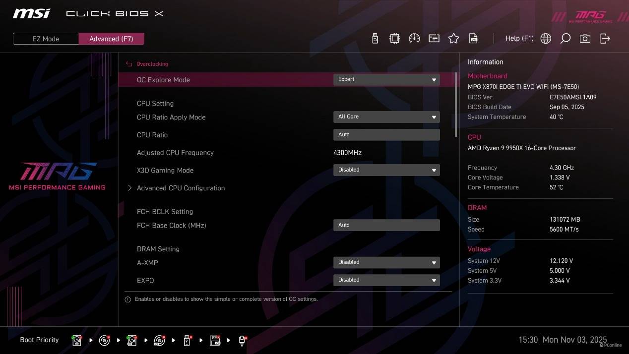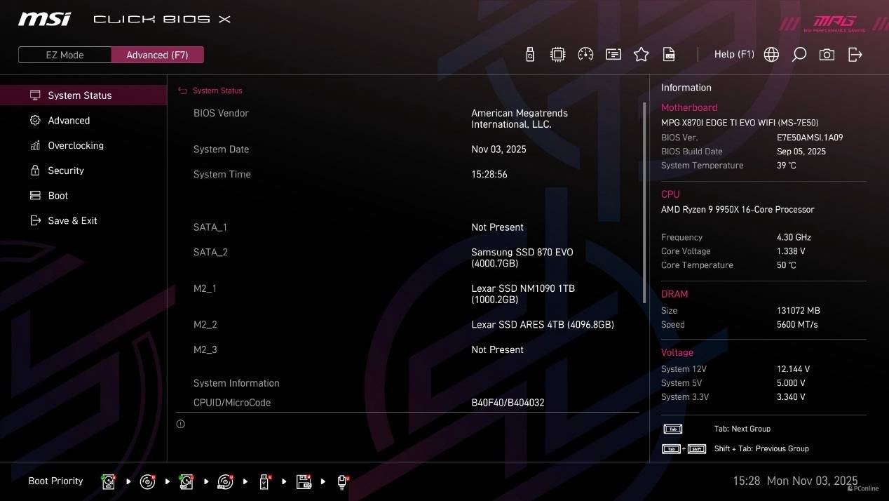 首次进到BIOS为简易模式,在这个模式下已经能够直接开启CPU的PBO功能、内存的EXPO设定以及X3D Gaming Mode,甚至还能直接找到Memory Try it功能。而高级模式下能够调整的就比较多了,并且微星将其分为了系统状态、高级、Overclocking、安全以及启动几个类目,方便玩家调整。