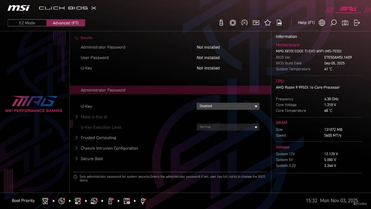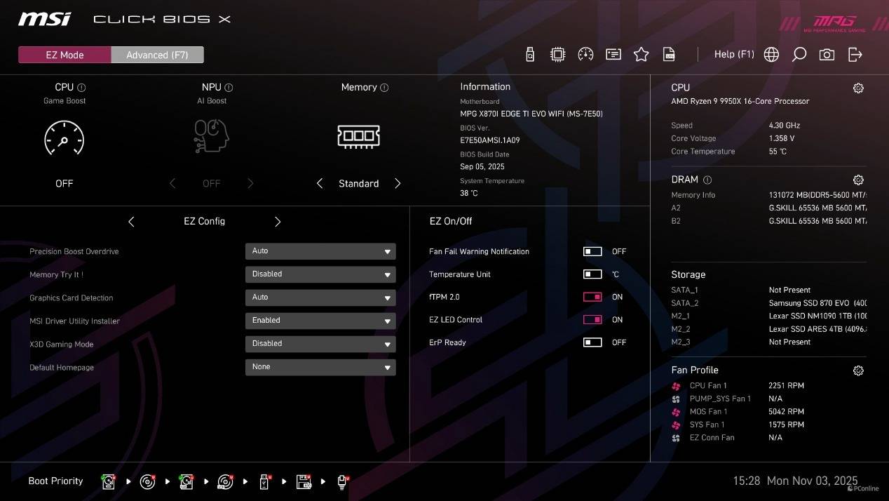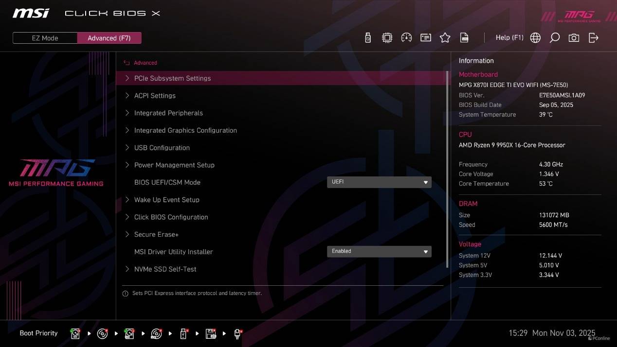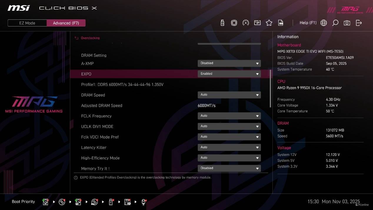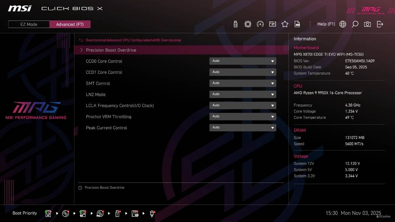 首次进到BIOS为简易模式,在这个模式下已经能够直接开启CPU的PBO功能、内存的EXPO设定以及X3D Gaming Mode,甚至还能直接找到Memory Try it功能。而高级模式下能够调整的就比较多了,并且微星将其分为了系统状态、高级、Overclocking、安全以及启动几个类目,方便玩家调整。