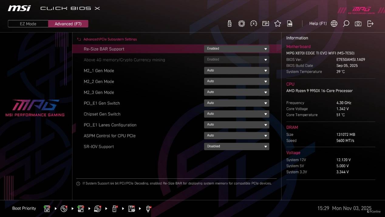 其中PCIe Subsystem Settings中有一个必须要开的功能——Re-Size BAR,开启以后,你的显卡才能满血释放。