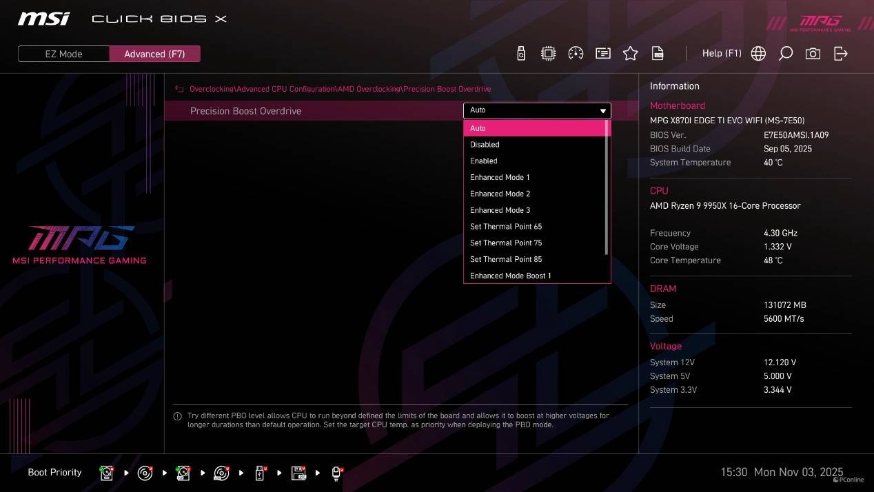 除此之外,微星在这里还针对CPU推出了特色PBO功能,不仅有常规的设定,还可以针对处理器设定不同的温度墙,分别为85°C、75°C和65°C三种温度限制。