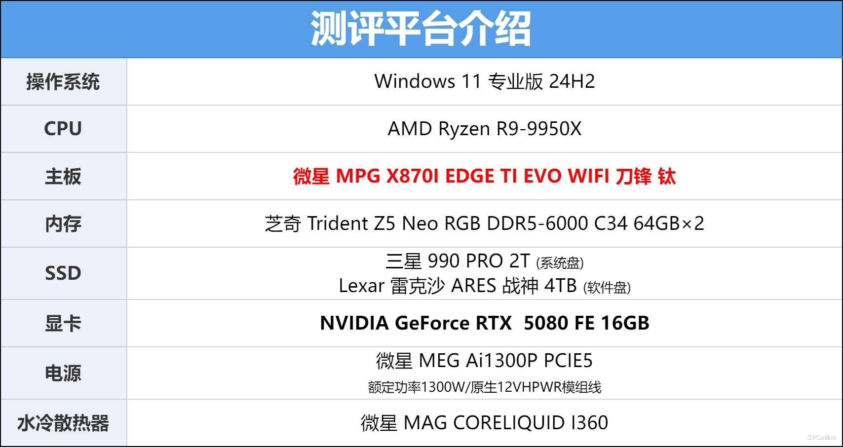 开始测试前,照例介绍一下本次的测试平台,为了发挥微星MPG X870I EDGE TI EVO WIFI刀锋 钛主板的最佳效能,我们用的是目前AMD的旗舰级处理器 9950X!内存则是两根64GB DDR5-6000组成128GB双通道。至于电源方面,我们这里用的是微星推出的MEG Ai1300P PCIE5电源,一款完全符合PCI-E 5.1和 ATX 3.2电源规范的高功率电池,可以为测试平台提供充足供电。