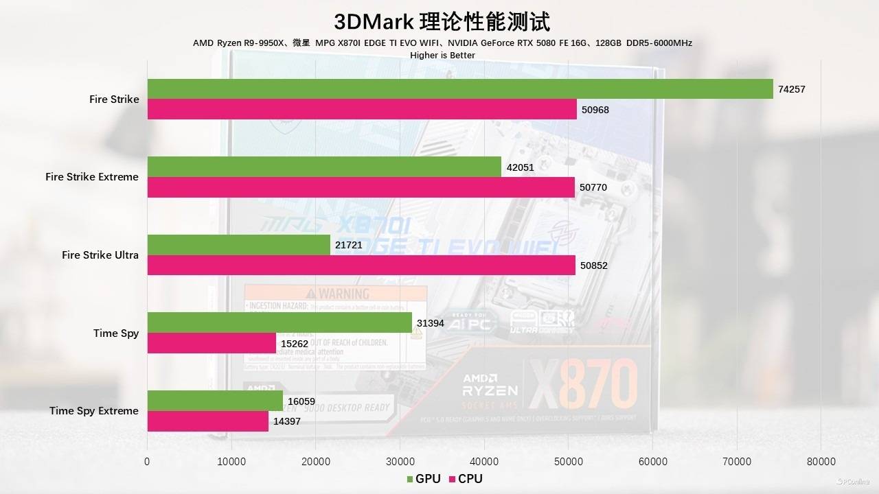 紧接着我们还测试了3DMark的理论性能,无论是在DX11的Fire Strike项目,还是DX12的Time Spy项目,成绩均相当优秀,特别是在Fire Strike中,9950X的成绩直接突破5W分大关,不得不说微星MPG X870I EDGE TI EVO WIFI刀锋 钛主板出色的供电配置才让这颗顶级神U有了不错的性能释放空间。