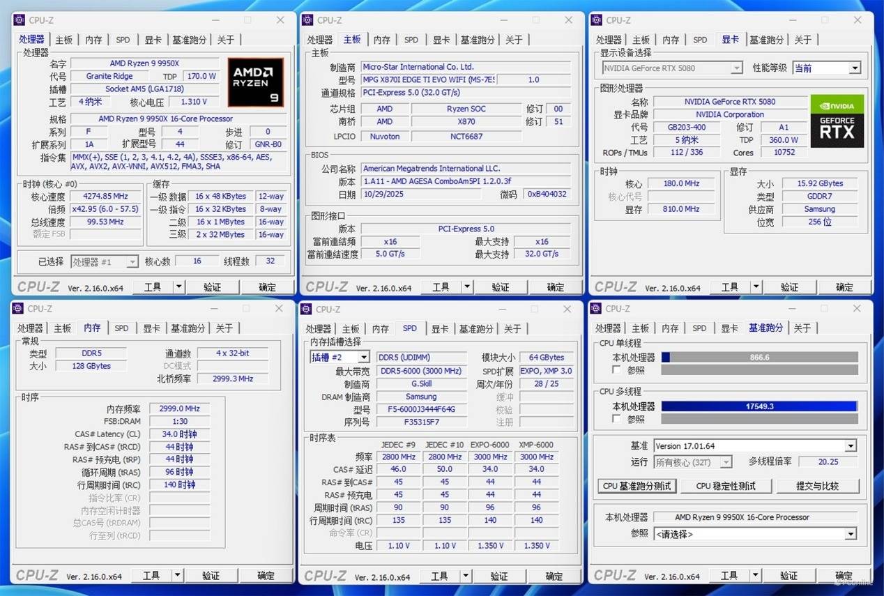 上机后,我们还是先在CPU-Z中看看平台硬件信息,同时也可以对处理器进行一定的性能测试。主板为上面提到的微星MPG X870I EDGE TI EVO WIFI刀锋 钛主板,支持PCIe 5.0标准。性能释放方面,实测9950X跑出了单核866.6,多核17549.3的成绩,看来这款主板的供电配置确实出色,完全能够胜任带动9950X的重任。
