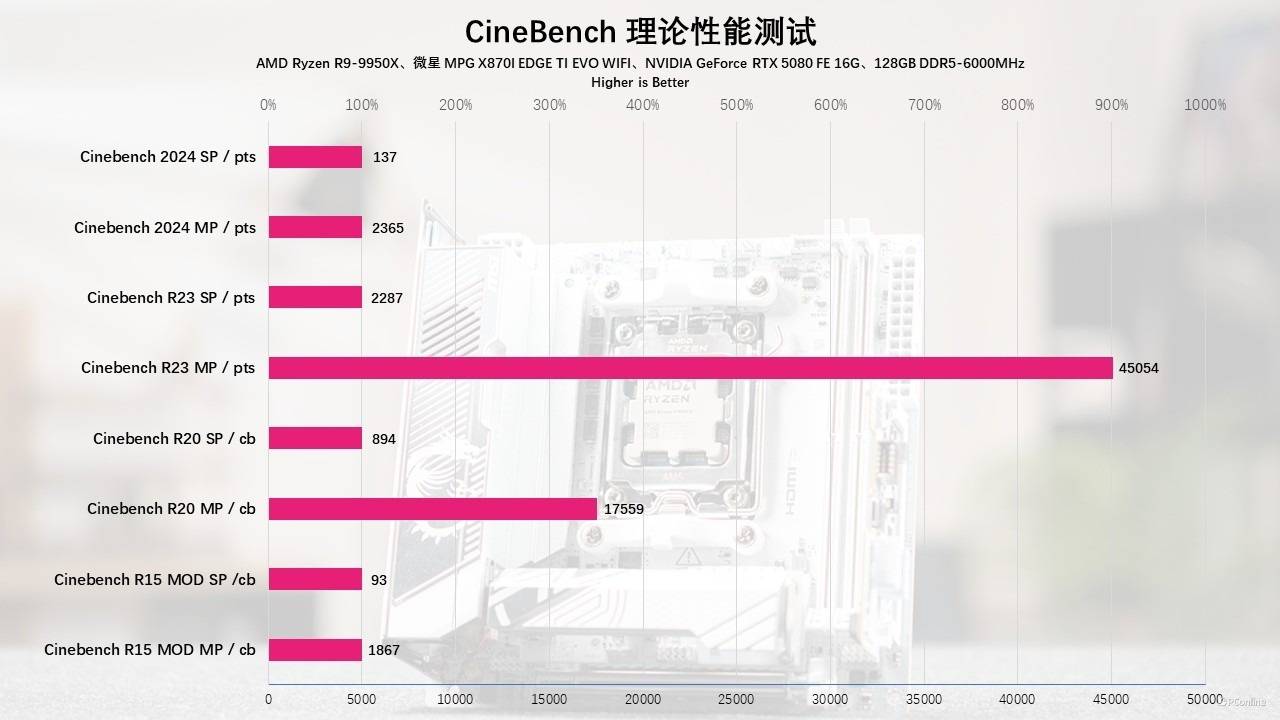 最后我们还对CineBench 也进行了全面测试,涵盖从早期的 CineBench R15 到如今更具挑战性的 CineBench 2024 各个版本。实测不管是单核还是多核成绩都很不错,其中最亮眼的莫过于R23的多线程测试,45054的分数傲世群雄,说明CPU性能释放得非常充分而且十分稳定,即使用来从事专业的设计渲染用途也没问题。
