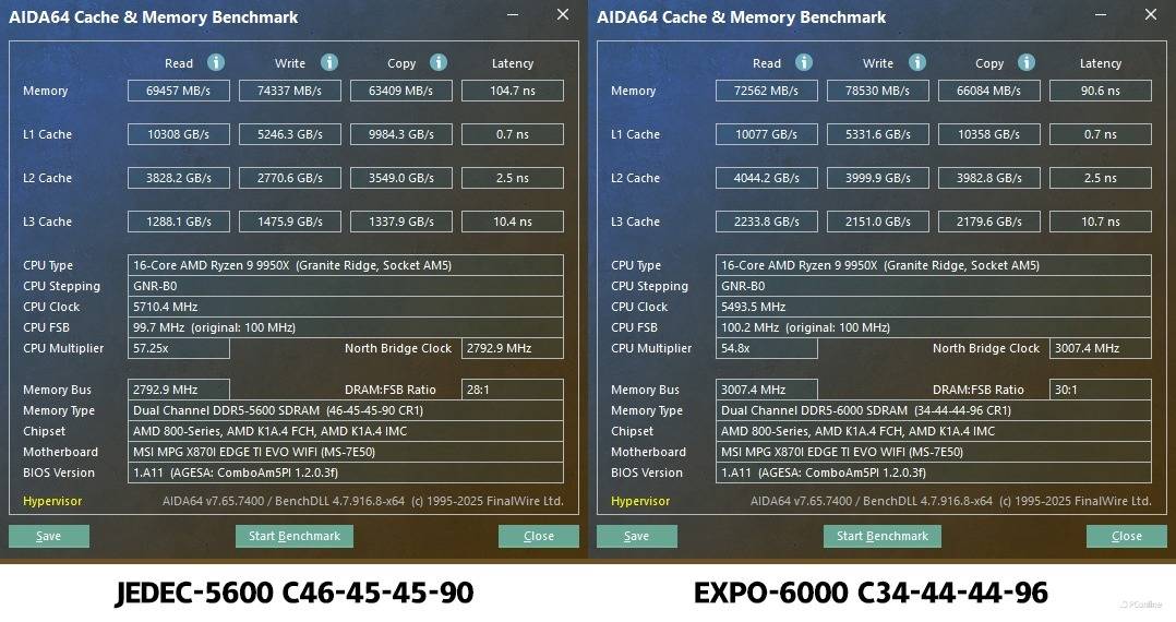 接着我们再来测试一下微星MPG X870I EDGE TI EVO WIFI刀锋 钛主板的内存性能表现,首先看看默认JEDEC-5600MHz的表现,此时内存的读取为69457MB/s,写入为74337MB/s,复制为63409MB/s,延迟是104.7ns。