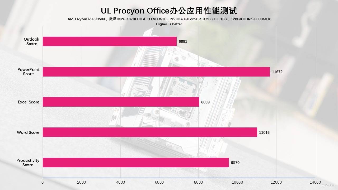 下面来点实际应用场景测试一下这套平台的表现如何,首先是最基本的办公能力测试,这里我们请出UL Procyon,实测这套平台总分为9570,其中各项得分分别为Word 11016分,Excel 8039分,PPT 11672分,Outlook 6881分。