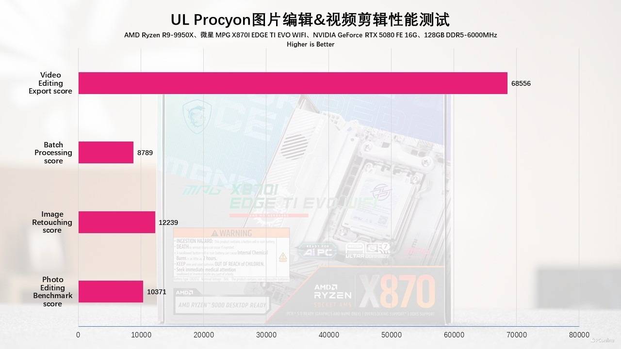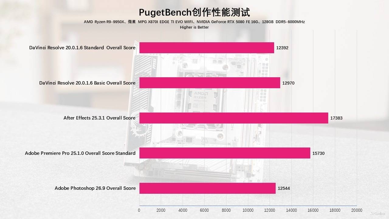 影像创作环节,我们还使用PugetBench进行测试,这里涵盖了Photoshop、PR、AE、LR等大家常用的Adobe软件,能够真实的模拟用户的使用场景,得出的成绩也更接近实际体验。实测在微星MPG X870I EDGE TI EVO WIFI刀锋 钛主板这套平台上,无论是简单的图像处理还是压力较大的视频剪辑与渲染层面,都有不错的成绩表现。