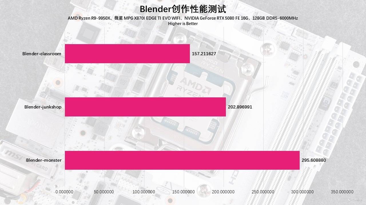而在渲染方面,搭载9800X3D的这套微星MPG B850I EDGE TI WIFI刀锋钛主板平台也不错,实测在Blender的三个场景渲染中,速度快且流畅,当然如果你有一张高性能的显卡还能有更高的速度。