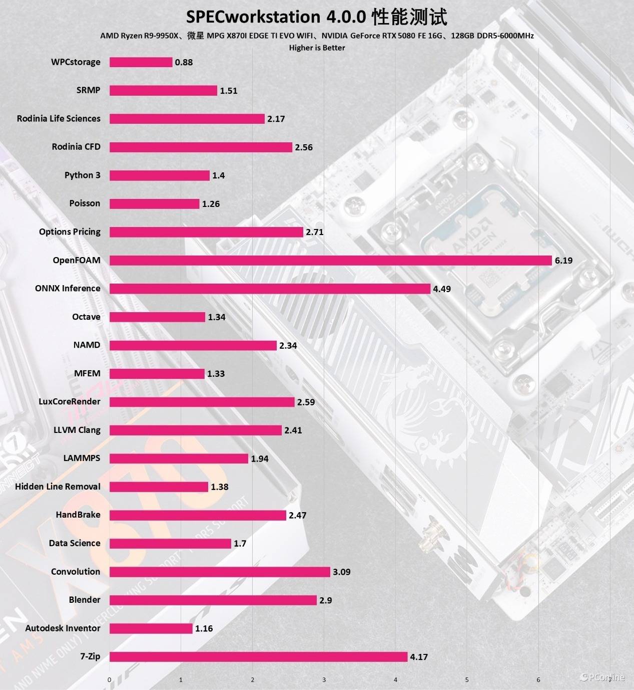 最后再来看看SPECworkstation 4方面的表现,它使用超过30个工作负载来测试CPU、图形、I/O和内存带宽。工作负载分为更广泛的类别,如媒体和娱乐,金融服务,产品开发,能源,生命科学和一般运营。实测搭载9950X的微星MPG X870I EDGE TI EVO WIFI刀锋 钛主板平台能够完全释放战力,各项得分都非常优秀。