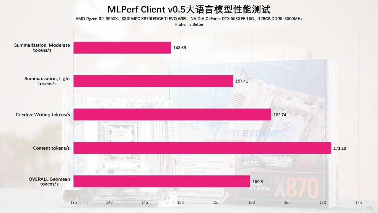 加大难度,我们还用MLPerf Client v0.5大语言模型进行,该模型基于meta的Llama 2 7B开源LLM打造,涵盖了内容生成、创意写作以及对不同长度文本进行总结摘要等四项AI任务。实测这套平台还是非常强势的,各项得分都非常出色,本地大语言模型在响应上也非常快。