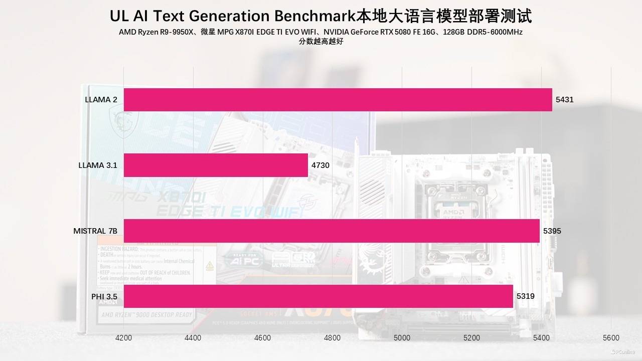 游戏过后,我们再来看看目前异常火热的AI应用表现,先来点简单的,这里我们测试了UL Procyon的AI Text Generation Benchmark,该测试会使用四款本地大语言模型,实测这套平台分别得分为LLAMA 2:5431分;LLAMA 3.1:4730分;MISTRAL 7B:5395分;PHI 3.5:5319分。