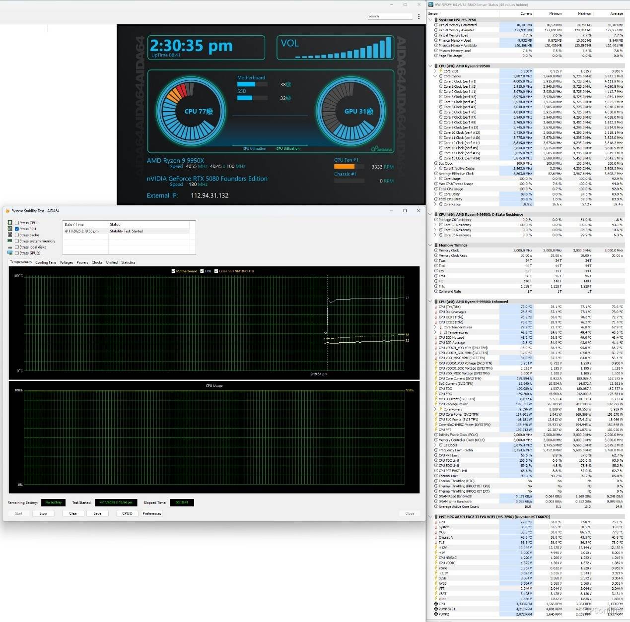 最后一项测试烤机,这也是许多玩家关注的重点。实测开启Set Thermal Point 85以后,整个烤机过程中,9950X都不会出现过热的情况,处理器功耗则是稳定在200W左右,温度表现则是控制在77℃之间。这个表现应对锐龙9000系处理器还是非常轻松的,玩家大可放心组装性能小钢炮。