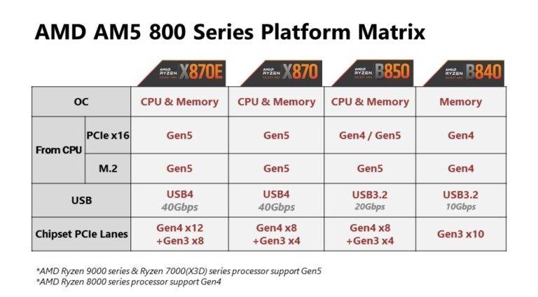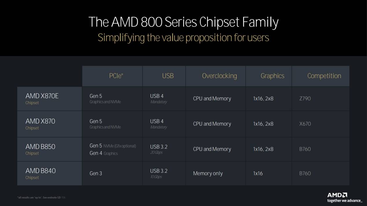 另外整个AMD 800系芯片组一共会有四款,分别是最顶级的X870E,X870以及定位主流的B850及全新的B840。不过最后这个B840更像上代的A620,其不支持超频,仅支持内存超频,并且南桥芯片不提供PCIe 4.0,仅有8条PCIe 3.0,而且CPU提供的PCIe通道也只有4.0,没有USB 4接口。