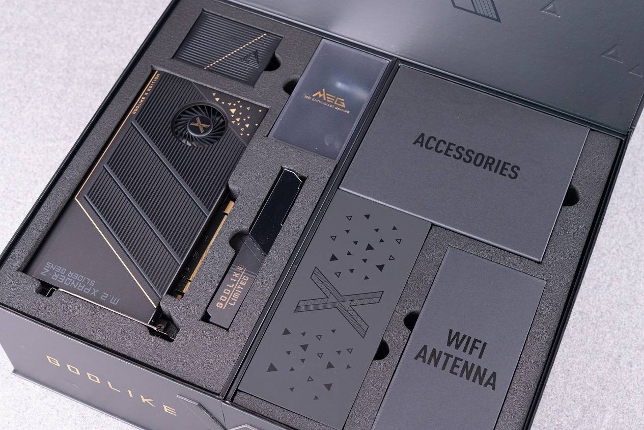 首先映入眼帘的正是微星MEG X870E GODLIKE X EDITION超神丰富的配件,除了有常规的PCIe 5.0速率的M.2扩展卡、一个EZ Control Hub集线盒、WiFi天线和若干连接线缆外,这次的GODLIKE X EDITION还额外给了定制纪念公仔、以及收藏展示底座。