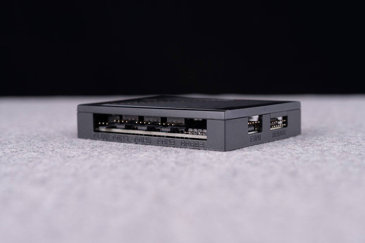 在这个扩展模块上,不仅有EZ Conn接口可以拆分出4-Pin PWM接口、5V ARGB接口、USB 2.0接口和RGB接口,还有EZ Control Hub接口通过EZ Link连接线和EZ Control Hub连接后,EZ Control Hub可以提供7个风扇接口、1个水流计接口、2个5V ARGB接口和1个RGB接口。